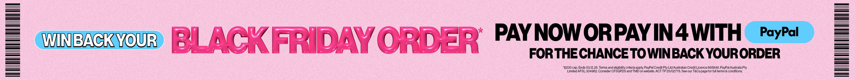33. PayPal Australia Pty Limited and PayPal Credit Pty Limited are not responsible for third party’s promotions and offers, including this promotion. The PayPal service is provided by PayPal Australia Pty Limited (ABN 93 111 195 389) which holds an Australian Financial Services Licence number 304962. Any information provided is general only and does not take into account your objectives, financial situation or needs. Before deciding to sign-up for or use the PayPal service you should consider the relevant User Agreement, Combined Financial Services Guide and Product Disclosure Statement and Target Market Determination, which are available at www.paypal.com/au. PayPal Pay in 4 is a continuing credit contract provided by PayPal Credit Pty Limited (ABN 66 600 629 258; Australian Credit Licence 568848) to Australian residents and is subject to eligibility criteria, credit application and suitability assessment. PayPal Pay in 4 is available on eligible transactions under AU$2,000 and application and use may impact a customer's credit score. Please read and consider the PayPal Credit Guide before entering into the PayPal Pay in 4 Facility Agreement. PayPal may disclose your personal information to a credit reporting body. To find out more about PayPal’s credit reporting practices, please see the Statement of Notifiable Matters.