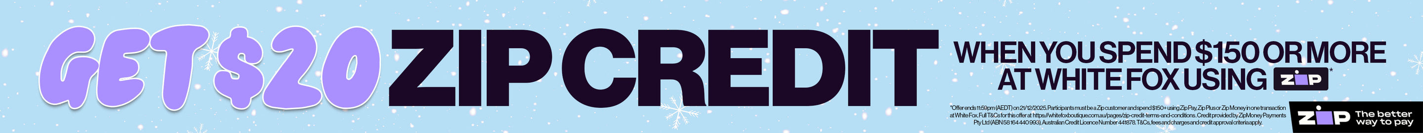 These terms and conditions apply to customers who spend a minimum of AU $150 at https://whitefoxboutique.com.au/ in a single new successful transaction during the Offer Period (defined below) and pay the total amount with Zip Pay, Zip Plus, or Zip Money as the mode of payment at checkout (“Eligible Order”). Customers who complete an Eligible Order will receive AU $20 credited to their Zip account within 30 days after the Offer Period. (“Offer”). Zip reserves the right to disqualify any Eligible Orders that are subsequently refunded, returned, cancelled or otherwise terminated for any reason.