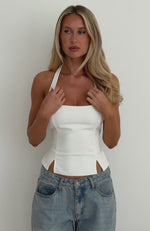 Sculpting silhouettes! The I'm Next Halter Top in Off White features halter straps, a square neckline, and a fitted bodice that flatters your form. A button closure at the nape and side zipper ensure a seamless finish, while the hem slit adds a touch of edge. Pair with jeans, boots, and layered gold jewellery for a concert‑ready ensemble.