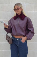 Exude boss girl energy in the No Competition Pu Bomber Jacket in Burgundy! Features a faux fur collar neckline, slouched shoulders, long sleeves with elasticated cuffs, zipper closure centre front, side pockets, and elasticated hemline for a cinched waist. All eyes are on you when styled with denim jeans, boots, and sunnies for a cool concert fit.