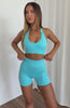 Introducing the Pace Seamless Sports Bra in Azure, your daily active essential. Designed with a fixed halter strap, scoop neckline, ribbed elasticated under bust hem and removable padding for customizable comfort. Finished with WFA initials at the centre back and crafted from soft, seamless fabric. Style with the matching Zoom Seamless Shorts 4" for a flawless active fit.