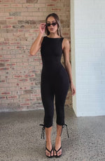 +69 loyalty pointsFeel effortlessly chic in the Problem Solved Sleeveless Jumpsuit in Black. This sleek piece features a jewel neckline, a fitted silhouette, and side splits at the pant hem adorned with self-tie bows. Crafted from high-stretch, unlined fabric, it offers both comfort and style. The backless design adds a daring touch, while the capri-length pants complete the look with modern flair. Style with kitten heels and layered gold jewellery for an effortlessly elevated fit.