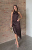 +99 loyalty pointsThe Sealed With Love Midi Dress Espresso is your invitation to stand out. Featuring a high cut neckline with a halter neck design and back self tie straps, midi length with an asymmetrical hemline and backless design. Style this vacation essential with thong heels and layered gold accessories for a stand out look!