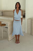Oceanside adventures await in the Tropic Drift Midi Skirt in Baby Blue. Designed with a comfortable elastic waistband, fully lined high‑stretch fabric, and a breezy handkerchief hem, it moves beautifully with every step. Style it with the matching On Display Halter Top in Baby Blue, chic kitten heels, and layered gold jewellery for a sun‑ready, effortless look.