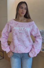 +69 loyalty pointsUnwind in style with our prettiest loungewear yet. The Vol. 1 Off Shoulder Printed Sweater in Posy Bow is designed with an off-the-shoulder neckline and ribbed hems, which round out an oversized silhouette. Featuring long sleeves and an unlined fleece interior, this hoodie delivers a cosy feel. White Fox puff print text embellishes the centre front. Style with your go-to denim jeans and colour sneakers for the cutest fit!
